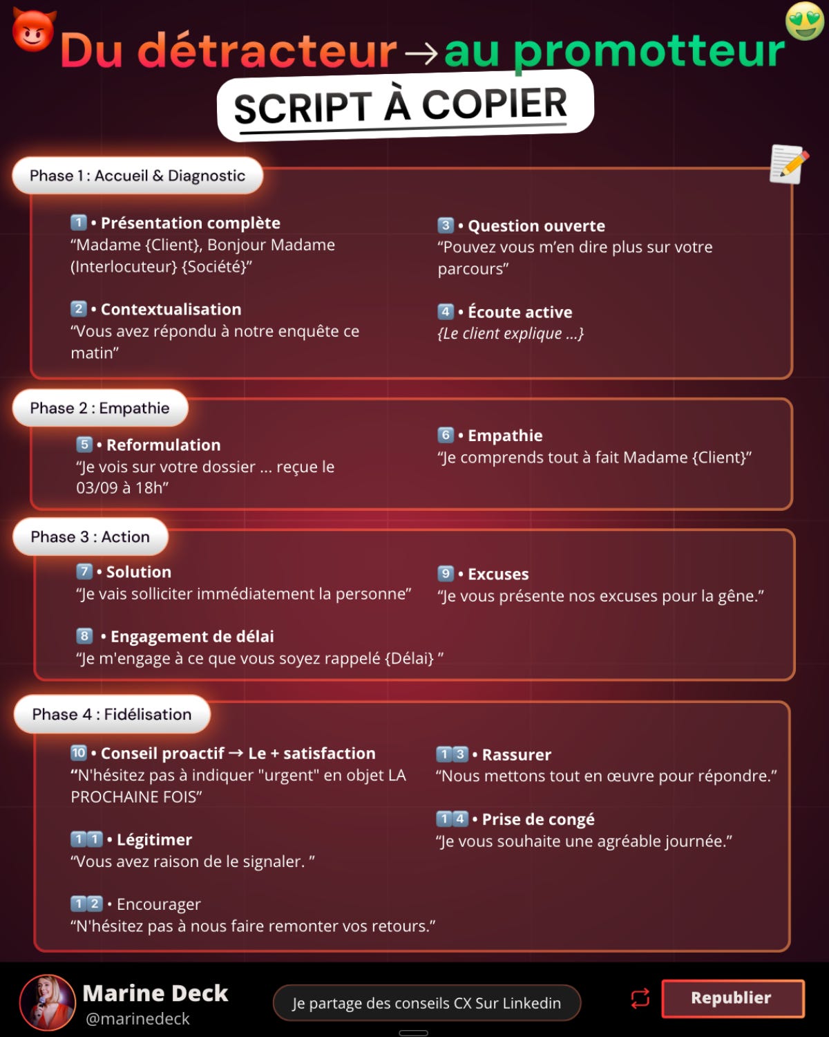 Reformuler = Prouver qu’on a compris Répéter avec des faits précis (”votre demande du 3/09 à 18h”) montre que vous ne noyez pas le poisson.