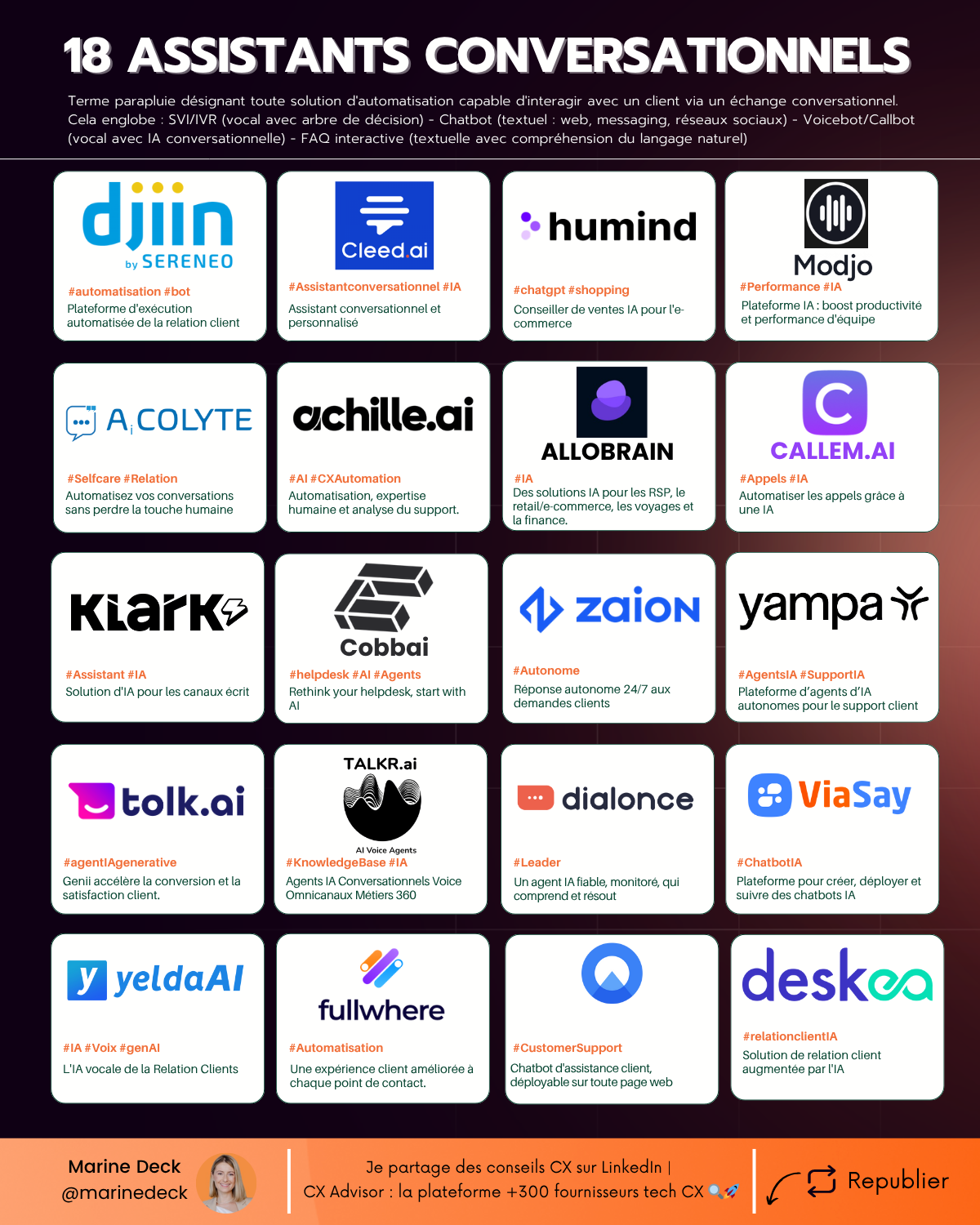 J’ai analysé avec CX Advisor ces 18 solutions d’assistants conversationnels du marché.